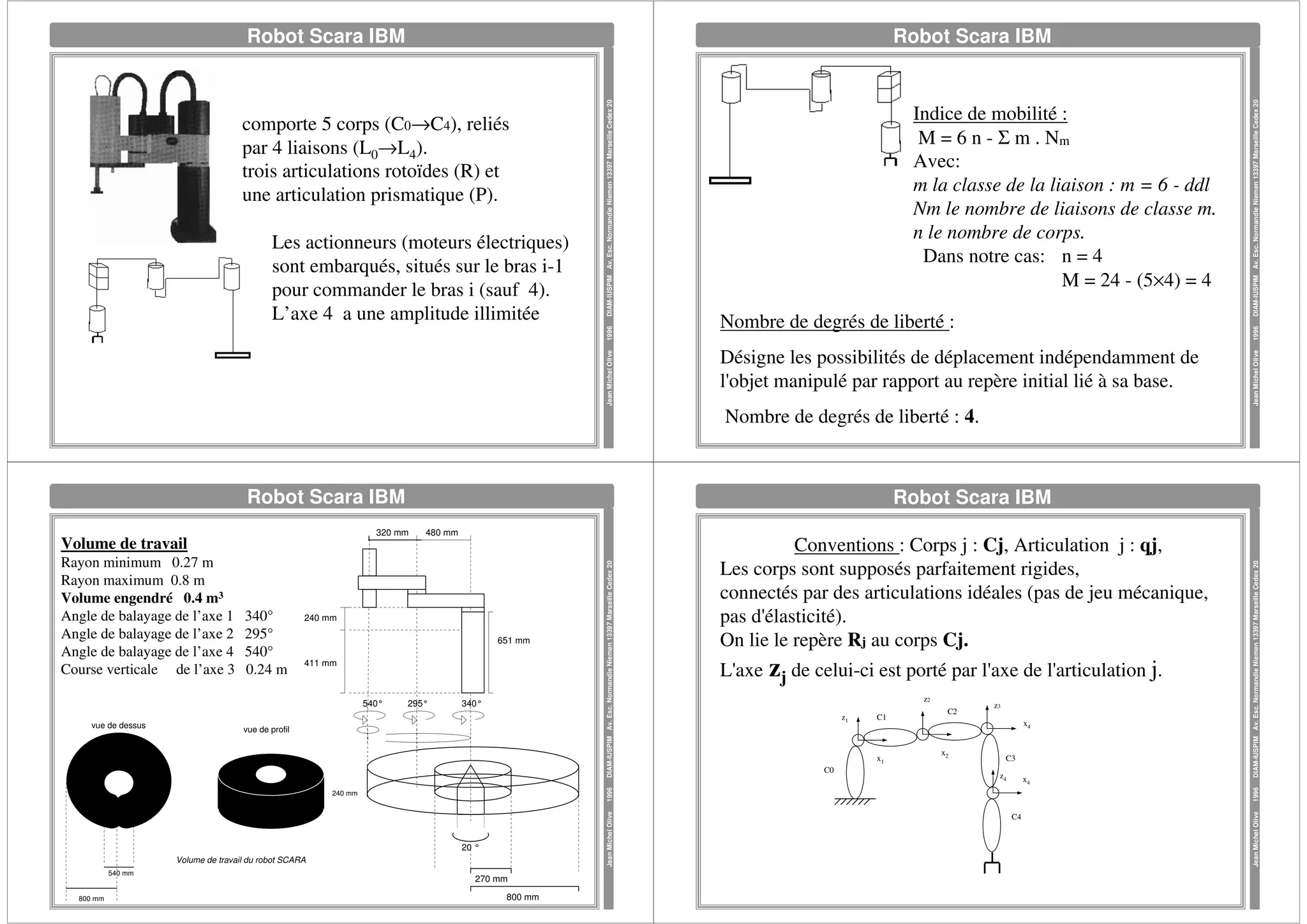 Le document présente une analyse technique du robot SCARA IBM à travers le calcul de ses degrés de liberté et la modélisation géométrique directe et inverse. Il détaille les paramètres de configuration, notamment les liaisons et les articulations, ainsi que les transformations de coordonnées nécessaires pour décrire la position de l'organe terminal. Des matrices de transformation sont décrites pour modéliser le comportement du robot en fonction de ses coordonnées articulaires.