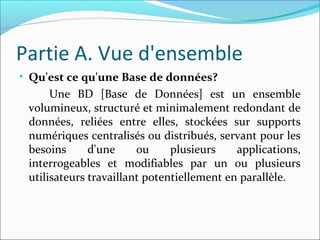 Une base de données (BD) est un ensemble structuré de données interrogeables et modifiables, tandis qu'un système de gestion de bases de données (SGBD) est un logiciel qui facilite leur structuration et leur maintenance. L'utilisation de SGBD résout des problèmes liés à la redondance et à l'incohérence des données, qui étaient fréquents avec des applications informatiques isolées. Les SGBD comme Oracle, MySQL, et PostgreSQL sont des exemples d'outils permettant une gestion efficace des bases de données dans divers contextes.