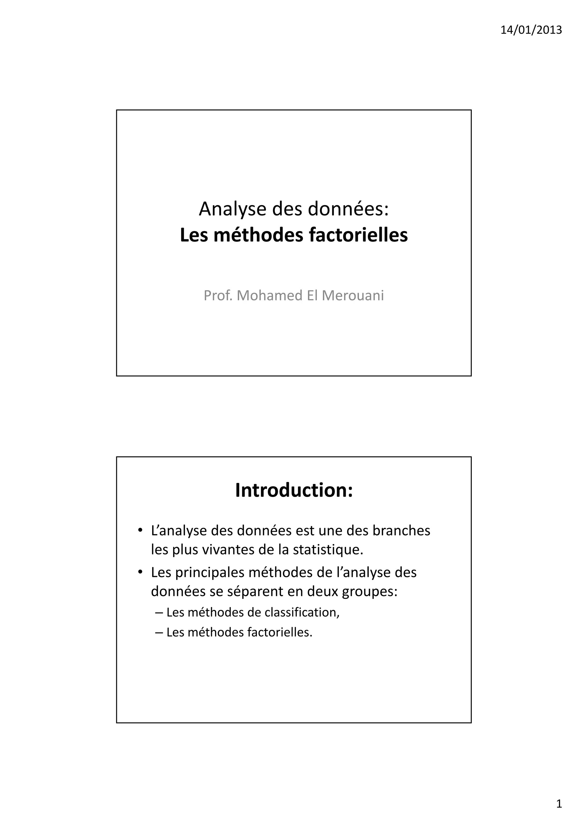 Le document traite des méthodes d'analyse des données, en se concentrant sur les méthodes de classification et factorielles. Ces dernières visent à réduire le nombre de variables et à obtenir une visualisation des relations entre elles, notamment à travers l'analyse en composantes principales (ACP) et l'analyse factorielle des correspondances (AFC). Bien que ces méthodes soient efficaces pour traiter des données complexes, elles présentent des imperfections, comme la déformation des nuages de points lors des projections.
