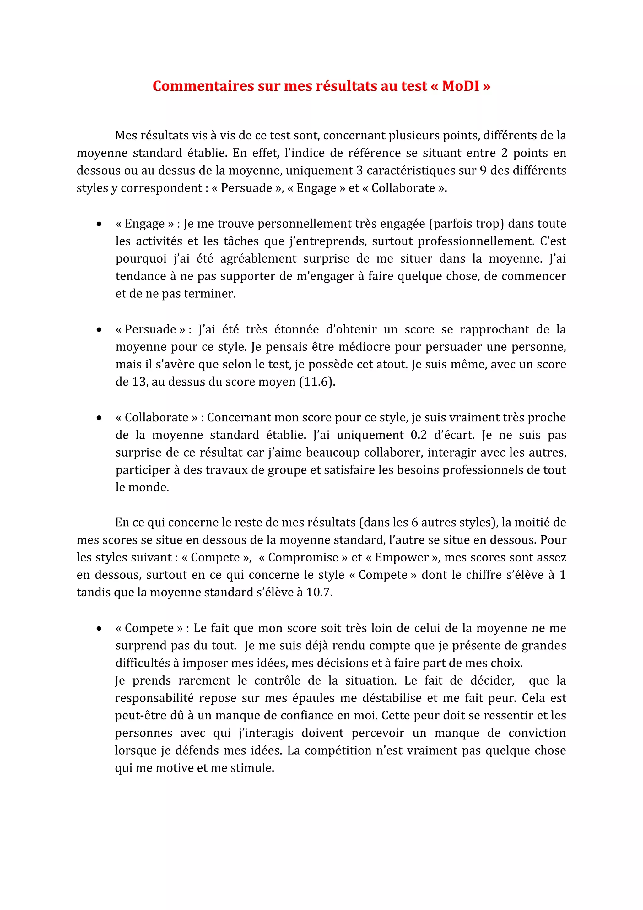 Le test « modi » a révélé que mes scores pour trois styles de communication, « persuade », « engage » et « collaborate », sont proches de la moyenne, tandis que les autres styles montrent des résultats variés. J'ai des difficultés significatives en « compete » et « empower », ce qui reflète un manque de confiance en moi et d'aptitude à prendre des décisions ou à déléguer. Cependant, je suis plus à l'aise avec les styles « avoid », « bargain » et « accommodate », ce qui me permet de mieux gérer les conflits et de m'adapter, même si cela peut parfois me désavantager.
