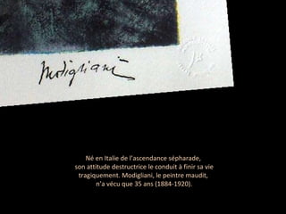 Amedeo Modigliani, peintre séfarade né en Italie, a vécu une vie dissolue à Paris, se distinguant par ses talents artistiques et ses relations tumultueuses avec des femmes, dont plusieurs ont connu des destins tragiques. Sa carrière, marquée par une consommation excessive de drogues et d'alcool, a conduit à sa mort précoce à 35 ans, suivie du suicide de sa compagne Jeanne Hébuterne. Aujourd'hui, ses œuvres sont très prisées, atteignant des prix exorbitants aux enchères.
