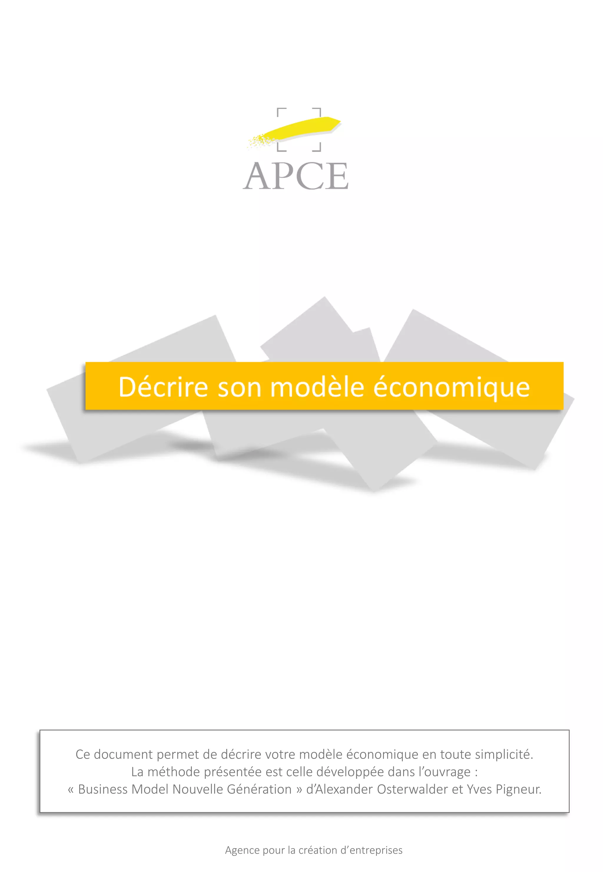Ce document présente la méthode du business model canvas pour décrire un modèle économique de manière claire et concise, en s'appuyant sur les principes de l'ouvrage 'Business Model Nouvelle Génération' d'Osterwalder et Pigneur. Il détaille comment identifier les clients, l'offre, les canaux, la relation client, les revenus, les ressources clés, les activités clés, les partenaires clés et les coûts nécessaires à la création d'une entreprise. Des outils pratiques, comme un canevas à imprimer, sont également proposés pour guider l'utilisateur dans la construction de son modèle économique.