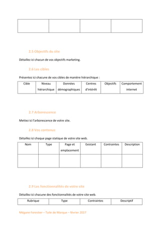 Le document présente un cahier des charges pour le projet web de l'entreprise Mégane Forestier. Il détaille l'historique, les activités, les attentes vis-à-vis du site, les objectifs marketing, les cibles, ainsi que les contraintes telles que la multilingue et les chartes graphiques et éditoriales. Un planning et un budget prévisionnel sont également inclus pour la mise en œuvre du projet.