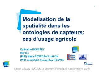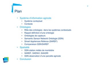 Ce document aborde la modélisation de la spatialité dans les ontologies des capteurs, avec un accent sur les applications agricoles et les systèmes d'information contextuels. Il décrit les différentes ontologies, y compris SSN et SAREF, ainsi que leur rôle dans l'intégration des données hétérogènes et la contextualisation des informations récoltées par les capteurs. Enfin, il souligne la nécessité de développer des pratiques cohérentes pour modéliser la spatialité en relation avec les observations agricoles.