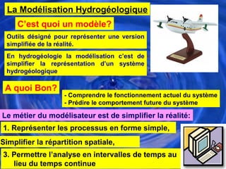 Ce document traite de la modélisation hydrogéologique, définissant un modèle comme une simplification de la réalité pour comprendre et prédire le comportement des systèmes hydrogéologiques. Il aborde également les données nécessaires pour établir un modèle, les divers types de modèles utilisés en hydrologie, et les équations fondamentales qui gouvernent les écoulements souterrains. Enfin, il décrit les étapes de développement d'un modèle, depuis la définition des objectifs jusqu'à la validation des résultats.