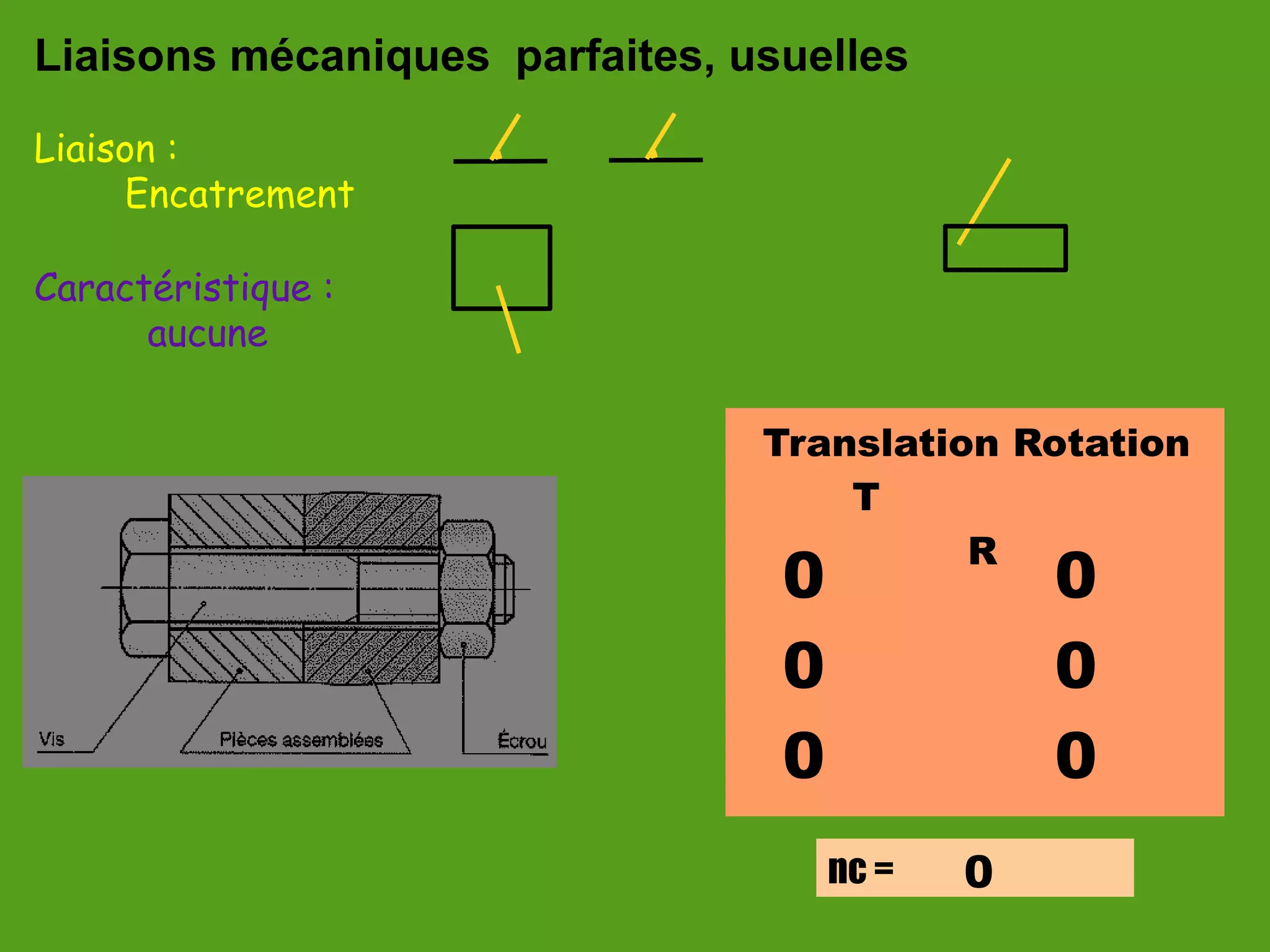 Le document décrit différentes liaisons mécaniques parfaites et usuelles, en précisant leurs caractéristiques, notamment les types de mouvements permis tels que la translation et la rotation. Il inclut des exemples tels que les liaisons de pivot, glissière et hélicoïdale, ainsi que leurs paramètres associés. Chaque type de liaison est associé à des notations spécifiques pour les déplacements et les orientations des axes.