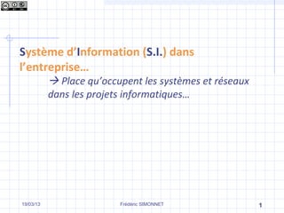 Le document traite des systèmes d'information (S.I.) en entreprise, en définissant leur rôle, leurs enjeux, et les effets sur l'organisation, les métiers et les conditions de travail. Il explore aussi les causes de succès et d'échec des projets S.I., ainsi que l'importance d'une méthodologie appropriée pour leur mise en œuvre. Enfin, il souligne l'impact attendu sur la performance globale de l'entreprise et l'importance de l'accompagnement du changement.