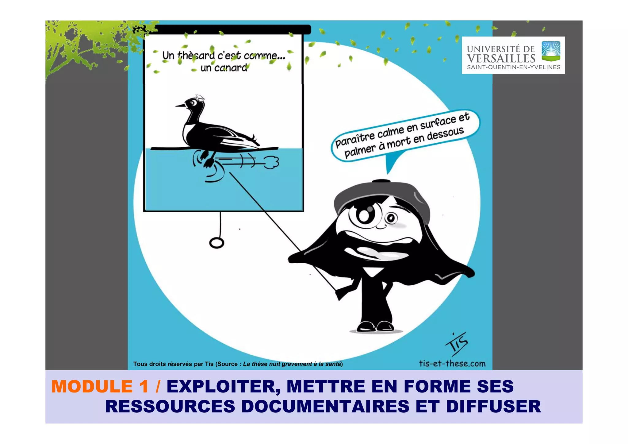 Le document présente les détails d'une formation sur l'exploitation des ressources documentaires, abordant des modules sur la bibliométrie, le droit d'auteur et l'open access. Il souligne également les lacunes dans la formation des doctorants concernant la recherche documentaire et les outils numériques, ainsi que les enjeux économiques associés à l'édition scientifique. Enfin, le texte évoque le mouvement vers l'open access et les avantages des archives ouvertes pour les chercheurs, tout en abordant les craintes liées à leur utilisation.