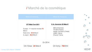 Le marché de la cosmétique global est évalué à 377 milliards d'euros, avec l'Europe en tête. Vichy, une marque de dermo-cosmétique créée en 1931, vise à attirer une clientèle plus jeune tout en conservant ses actives d'une cible plus âgée. La marque doit également améliorer sa présence numérique et sa stratégie sur les réseaux sociaux pour rester compétitive dans un marché en constante évolution.