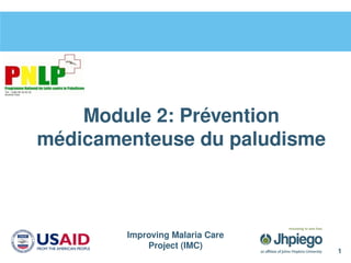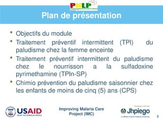 La lutte contre le paludisme devrait aborder quatre volets : Le premier volet est les soins prénatals focalisés de qualité, dont l'éducation sanitaire et les conseils concernant le paludisme pendant la grossesse. Le second volet est le traitement préventif intermittent (ou TPI) qui est parfois appelé également «traitement présomptif intermittent» ou «traitement protecteur intermittent.» Aux fins de cette présentation, nous utiliserons «traitement préventif intermittent» correspondant à la terminologie de l'OMS. Le troisième volet pour le contrôle du paludisme est d'utiliser les moustiquaires imprégnées d'insecticide, et le quatrième volet est la prise en charge du paludisme.