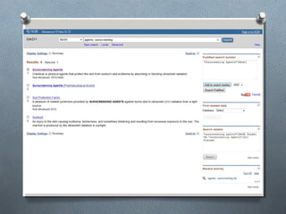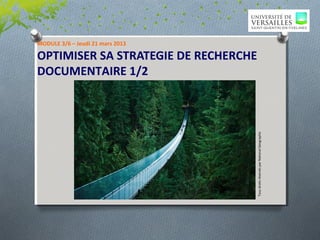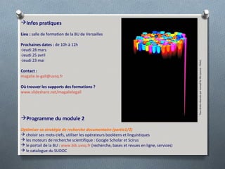 Le document présente un module de formation sur l'optimisation de la stratégie de recherche documentaire, abordant des techniques telles que le choix de mots-clés, l'utilisation d'opérateurs booléens et l'accès aux moteurs de recherche scientifiques. Il décrit également le portail de la bibliothèque universitaire, les ressources disponibles et les services liés aux recherches documentaires. Enfin, il met en avant divers outils et bases de données pour faciliter la recherche d'informations académiques et scientifiques.