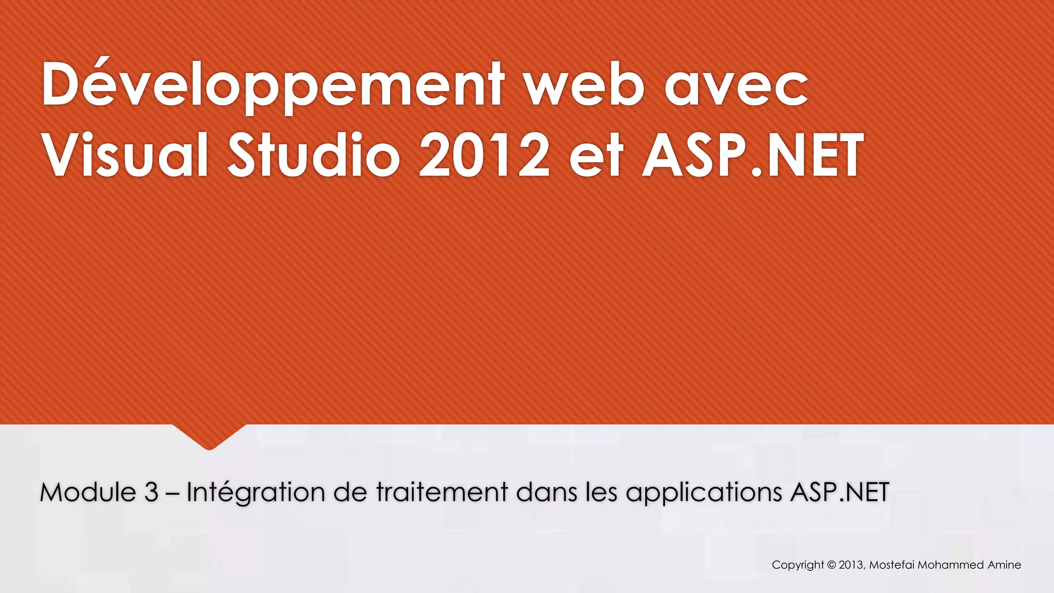 Le module 3 du développement web avec ASP.NET et Visual Studio 2012 traite de l'intégration de traitements dans les applications ASP.NET, incluant la programmation, la gestion des événements et le cycle de vie des pages. Il souligne l'importance du code behind pour faciliter la maintenance et aborde la gestion des événements au niveau applicatif via le fichier global.asax. En outre, il explique le concept de postback et les différences entre les événements côté serveur et côté client.
