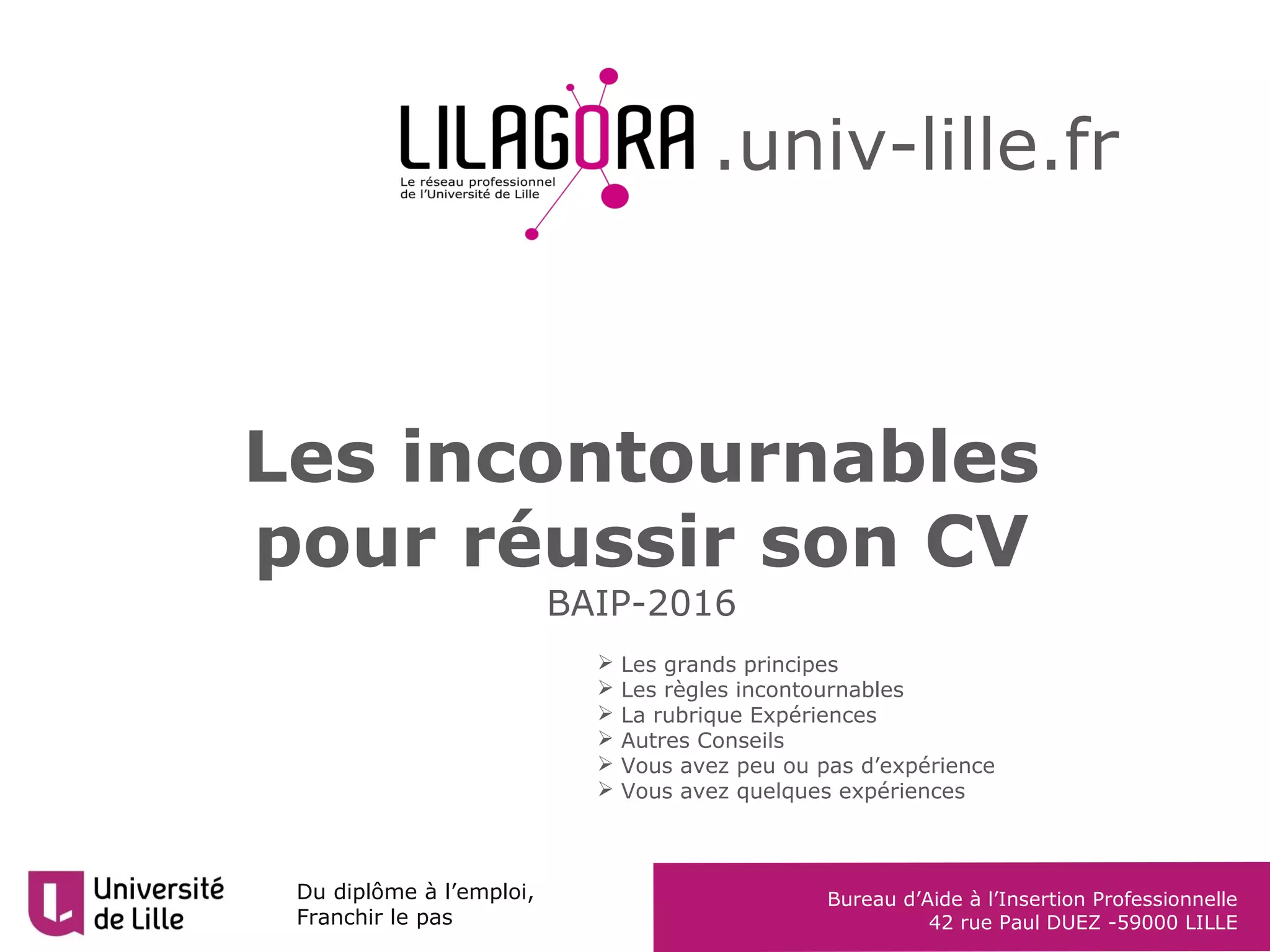 Le document fournit des conseils pour réussir un CV en se concentrant sur des éléments essentiels comme la précision, la clarté et la pertinence des informations présentées. Il souligne l'importance de détailler les expériences et les compétences tout en évitant les éléments superflus et en adaptant la mise en forme aux attentes des recruteurs. Des recommandations spécifiques incluent l'ordre des rubriques, la nécessité d'utiliser des mots clés et la présentation d'une photo professionnelle.