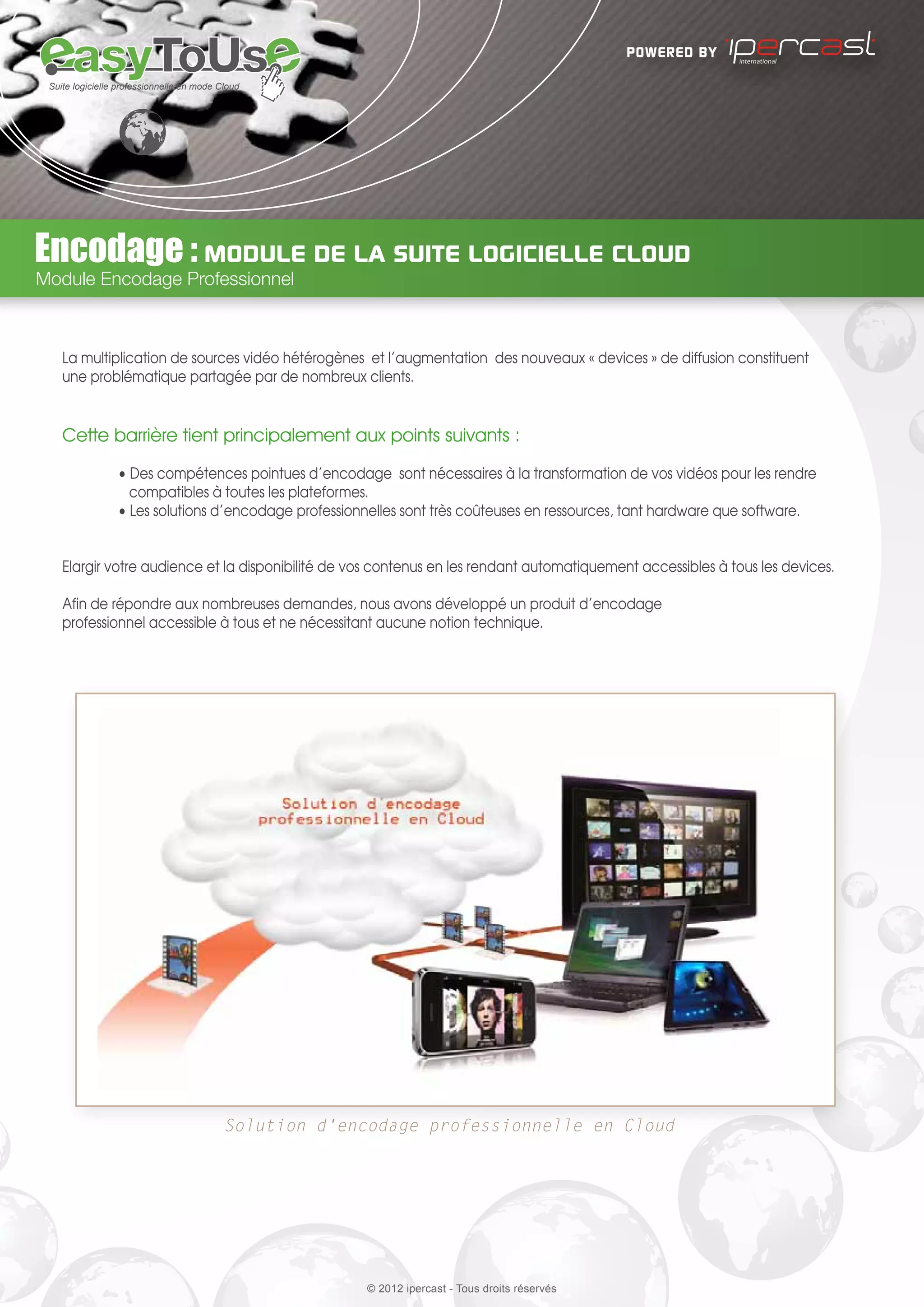 Le document présente une solution d'encodage vidéo en cloud, accessible sans compétences techniques, adaptée à divers dispositifs. Ce service propose plusieurs modes d'implémentation et d'encodage, avec une infrastructure monitorée 24/7, offrant des mises à jour régulières des codecs. Les utilisateurs peuvent choisir parmi différents packages tarifaires selon leurs besoins d'encodage.