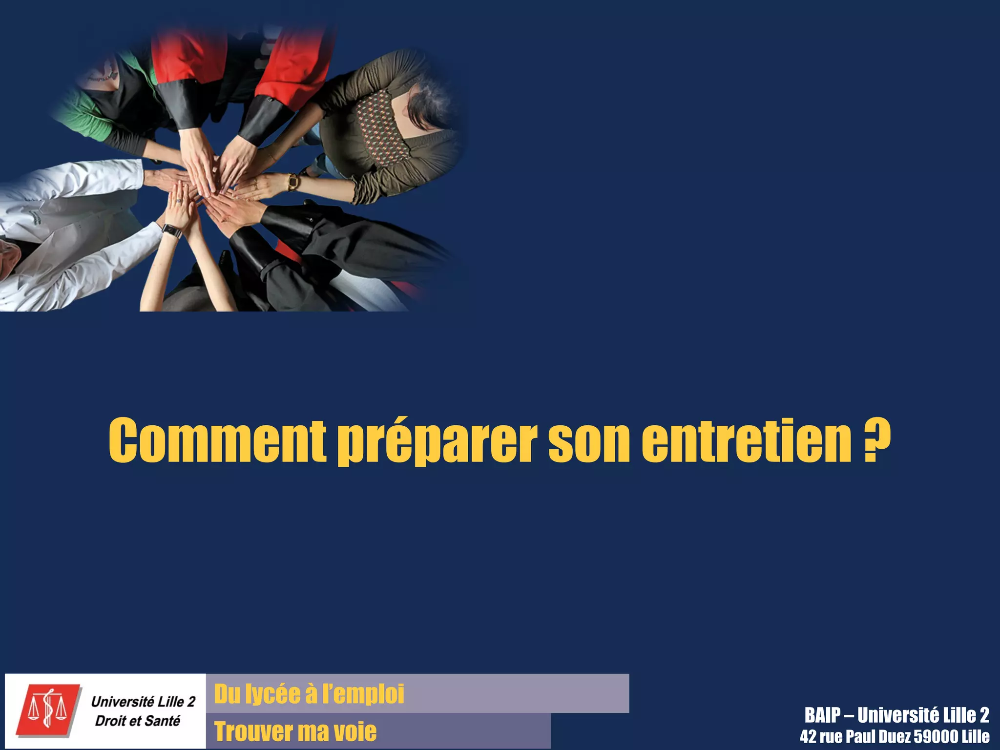 Ce document propose des conseils pratiques pour préparer un entretien d'embauche, en couvrant des aspects tels que la gestion du stress, l'analyse de l'entreprise, et la préparation des réponses aux questions fréquentes. Il souligne l'importance de se connaître soi-même, d'être clair sur ses compétences et motivations, et de se préparer à faire bonne impression. Il fournit également un guide structurée pour présenter son parcours de manière efficace et professionnelle.