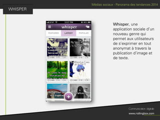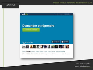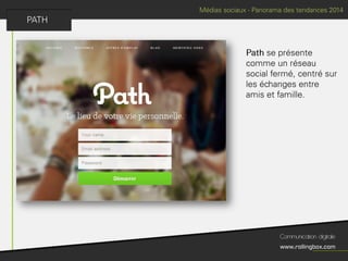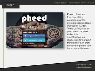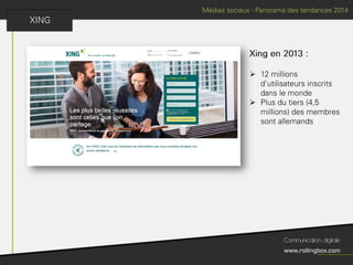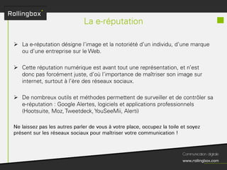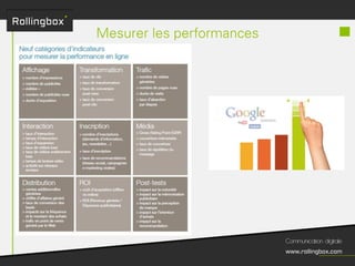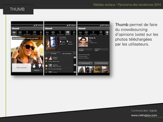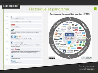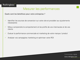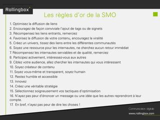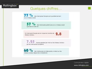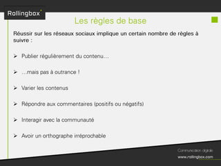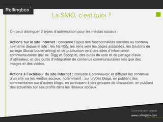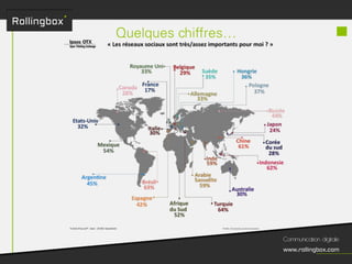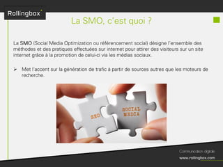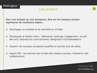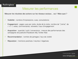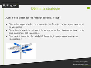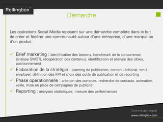 Le document décrit un processus en quatre étapes : écouter, définir, planifier et mesurer. Chaque étape inclut des sous-tâches comme la recherche de cibles, la définition des objectifs, la création d'un planning de publications et l'identification des KPI pour mesurer le ROI. Ce cadre méthodologique est centré sur l'optimisation de la gestion de marque et de la communauté.