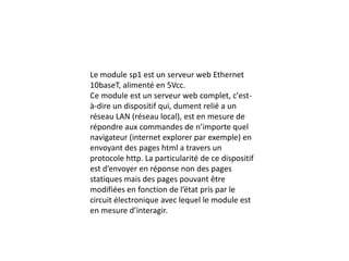 Le module SP1 est un serveur web Ethernet 10Base-T fonctionnant sous 5V, capable de répondre aux navigateurs avec des pages HTML dynamiques selon l'état du circuit électronique. Il opère sur un réseau local en utilisant le protocole HTTP et s'appuie sur le modèle OSI et TCP/IP à différentes couches, y compris physique, liaison, réseau, transport et application.