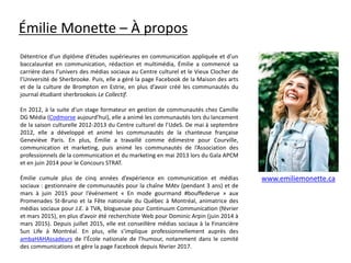 Émilie Monette est une spécialiste en communication avec plus de cinq ans d'expérience dans la gestion des médias sociaux et des communautés pour diverses organisations, notamment Sun Life et MATV. Elle a également travaillé sur de nombreux événements culturels et projets médiatiques, développant des stratégies de contenu et animation des réseaux sociaux. Son portfolio met en avant une solide expertise dans le domaine des médias sociaux et un engagement dans des projets variés allant de la culture à la finance.