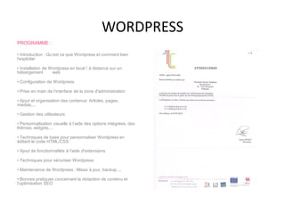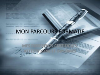 Le document présente un parcours formatif comprenant des programmes sur WordPress, Photoshop, l'usage professionnel des réseaux sociaux, l'initiation à la technique PC et réseaux, ainsi que la bureautique et la gestion des PME. Chaque programme couvre des compétences essentielles et techniques spécifiques pour maîtriser ces outils et pratiques. Il inclut également des attestations de réussite et divers diplômes liés aux domaines de la comptabilité et de la gestion des entreprises.