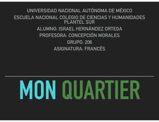 L'élève Israël Hernández décrit son quartier, Desarrollo Urbano Quetzalcoatl, situé à Iztapalapa, qui est agréable mais aussi dangereux. Il mentionne la présence de nombreuses épiceries, parcs, écoles, et églises, mais note l'absence de supermarchés, cinémas et hôpitaux. Son appréciation pour le quartier est mitigée en raison de ses aspects conflictuels.