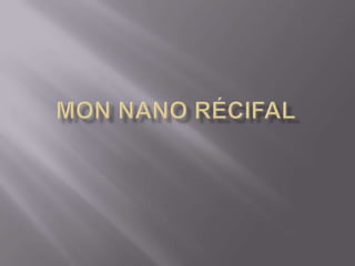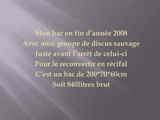 Le document décrit la création d'un aquarium récifal de 840 litres, débutée le 2 janvier 2009, incluant le nettoyage, le perçage, et l'installation d'une décante. Après plusieurs étapes de montage et d'introduction de pierres vivantes, le bac est en fonctionnement depuis un mois. Des poissons et coraux ont été ajoutés, ainsi qu'un refuge pour l'élevage d'artémias salina.