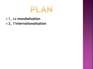 La mondialisation désigne l'accélération des échanges à l'échelle mondiale, englobant des dimensions économiques, culturelles et organisationnelles, et ayant des effets significatifs sur les sociétés contemporaines. Elle est accompagnée d'une croissance des échanges commerciaux et d'une émergence d'une finance mondiale, tandis que l'internationalisation des entreprises représente un processus de développement hors de leurs frontières nationales. Les stratégies d'internationalisation peuvent varier, allant de l'orientation stratégique globale à celle multinationale, déterminant ainsi la manière dont les entreprises s'engagent sur le marché international.