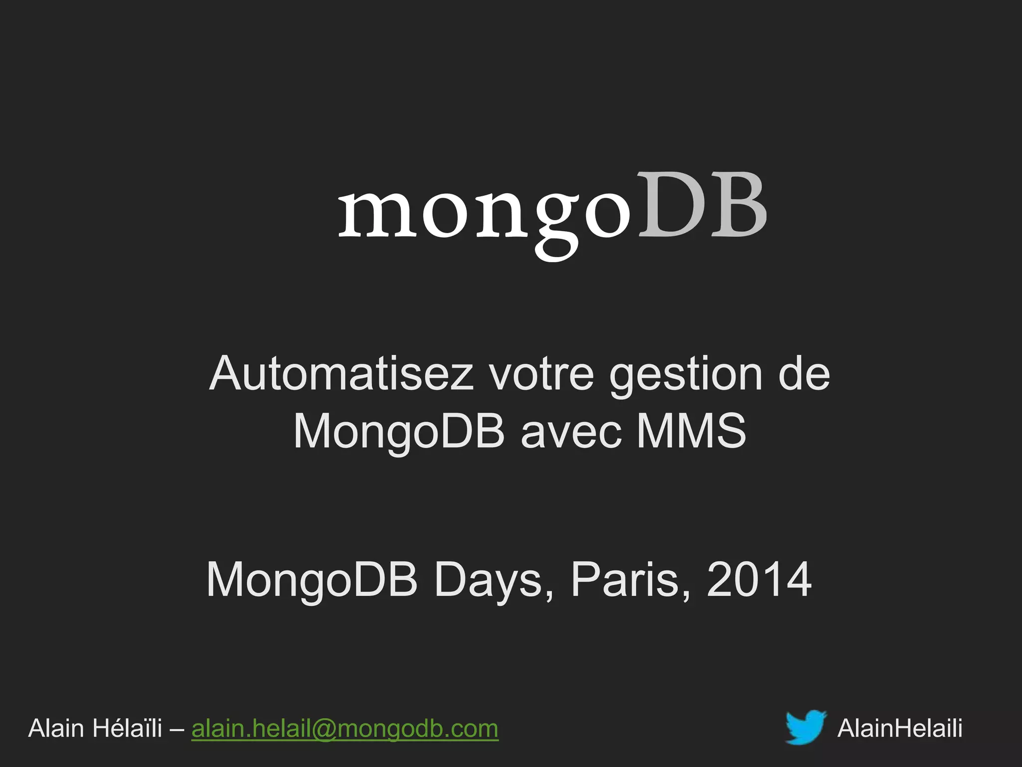 Le document décrit comment automatiser la gestion de MongoDB à l'aide des services de gestion de MongoDB (MMS) lors d'une présentation à Paris en 2014. Il aborde les aspects de scalabilité, de monitoring et de backup, tout en présentant des solutions de réplication et de sauvegarde pour assurer la continuité des opérations et la récupération après sinistre. En conclusion, il souligne l'importance de l'automatisation et du monitoring pour une gestion efficace des déploiements MongoDB.