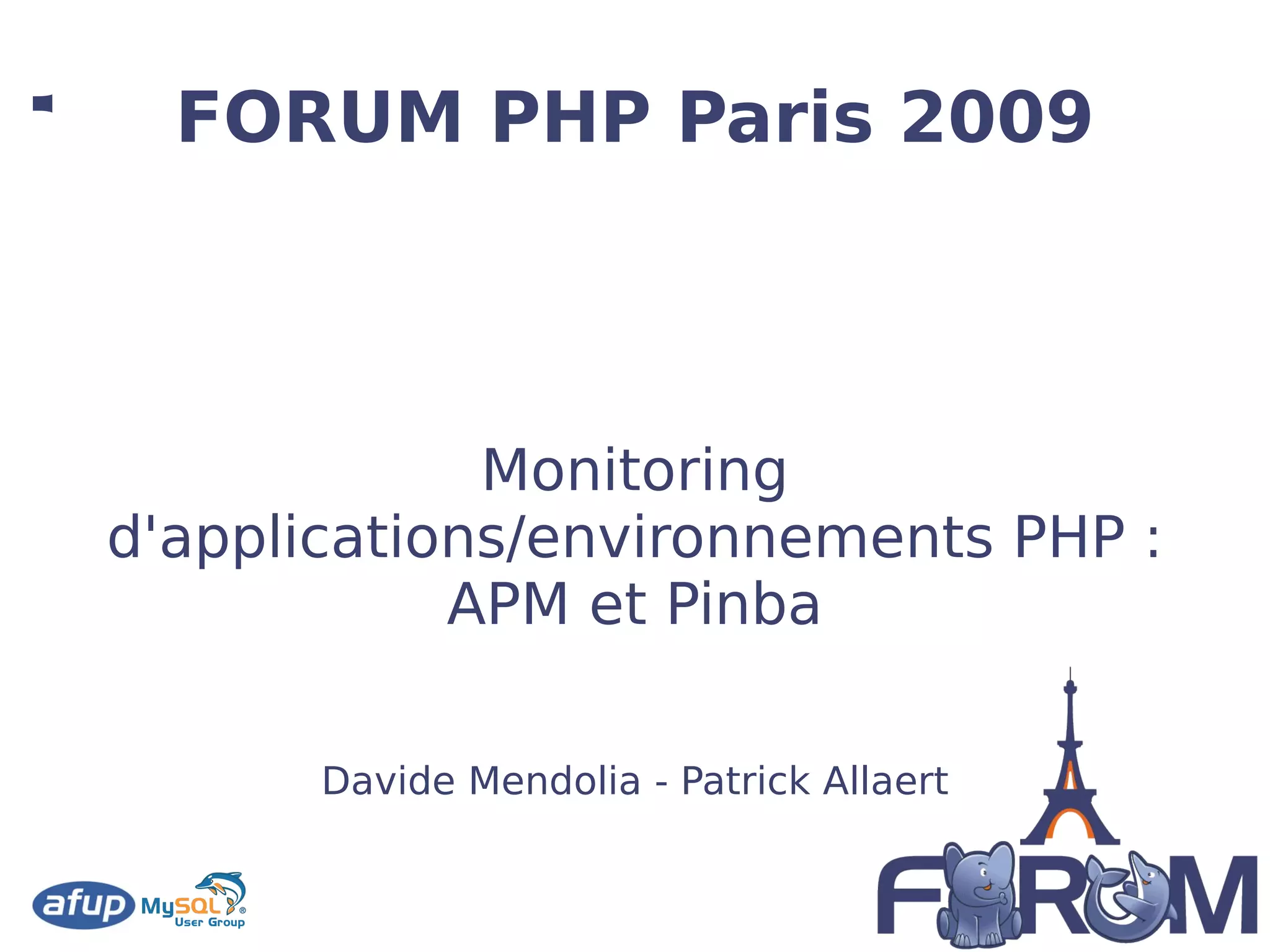 Le document présente des discours sur le monitoring des applications PHP, en mettant en avant des outils comme APM et Pinba pour gérer la performance et les erreurs dans l'environnement LAMP. Les orateurs, Davide Mendolia et Patrick Allaert, partagent leurs expériences et les fonctionnalités de ces outils pour améliorer la disponibilité et l'expérience utilisateur. Ils appellent également à la contribution de la communauté pour le développement continu de ces solutions.