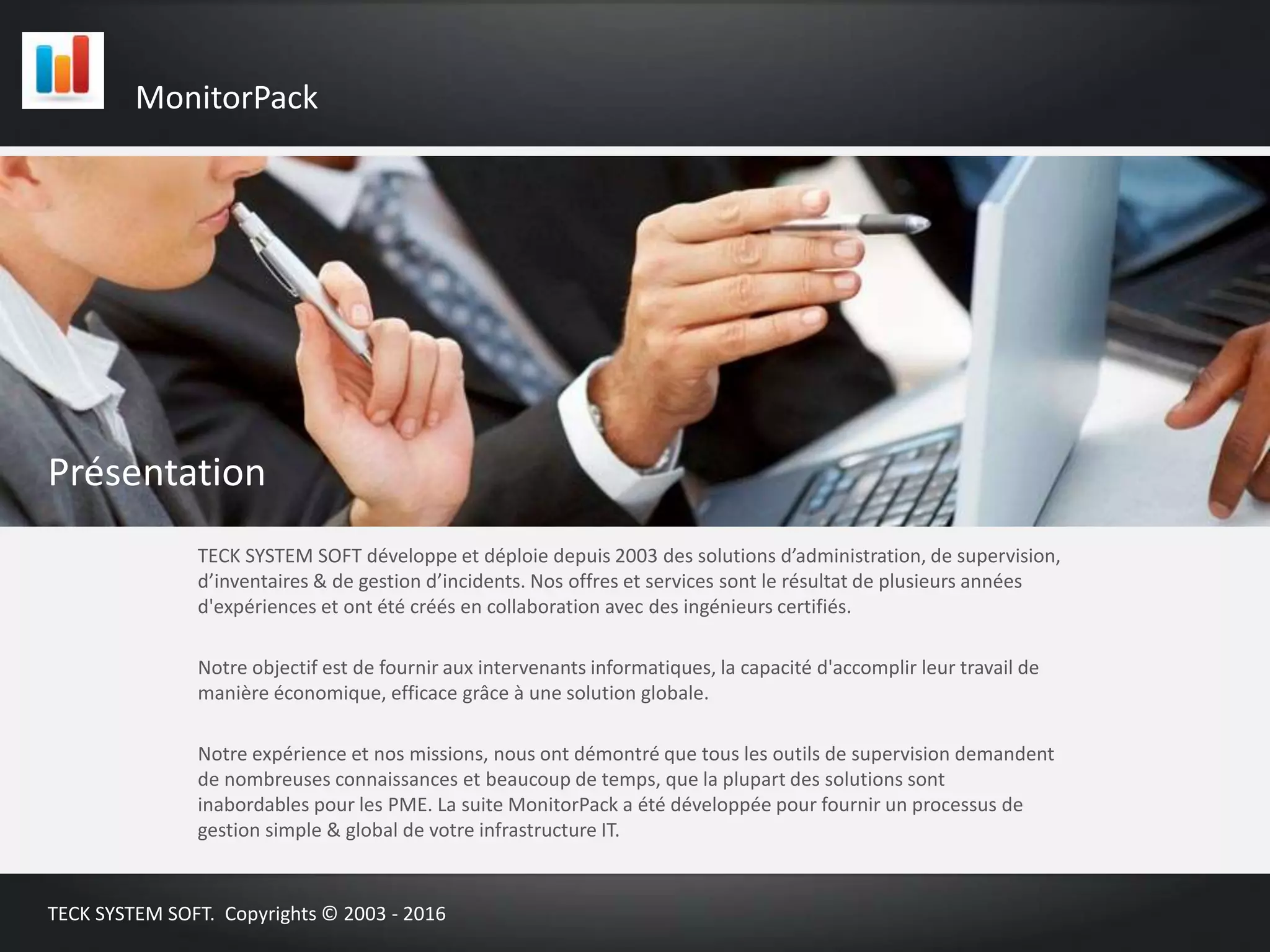 Teck System Soft développe et déploie depuis 2003 des solutions d'administration et de supervision IT, incluant la suite Monitorpack, conçue pour simplifier la gestion d'infrastructures informatiques tout en étant économique pour les PME. Monitorpack offre des fonctionnalités telles que la supervision automatisée, l'inventaire des parcs, et la gestion des incidents, le tout sans déploiement d'agent. La solution propose également un accès cloud sécurisé et un support étendu pour garantir la disponibilité maximale des services.