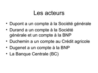 Le document décrit les transactions bancaires entre plusieurs acteurs et leur impact sur la masse monétaire. Il explique que certaines opérations, comme les dépôts et virements, n'affectent pas la création monétaire, tandis que l'octroi de crédits par les banques peut en créer. Enfin, il aborde un problème de liquidité auquel la BNP est confrontée, suggérant des solutions via les autres banques.