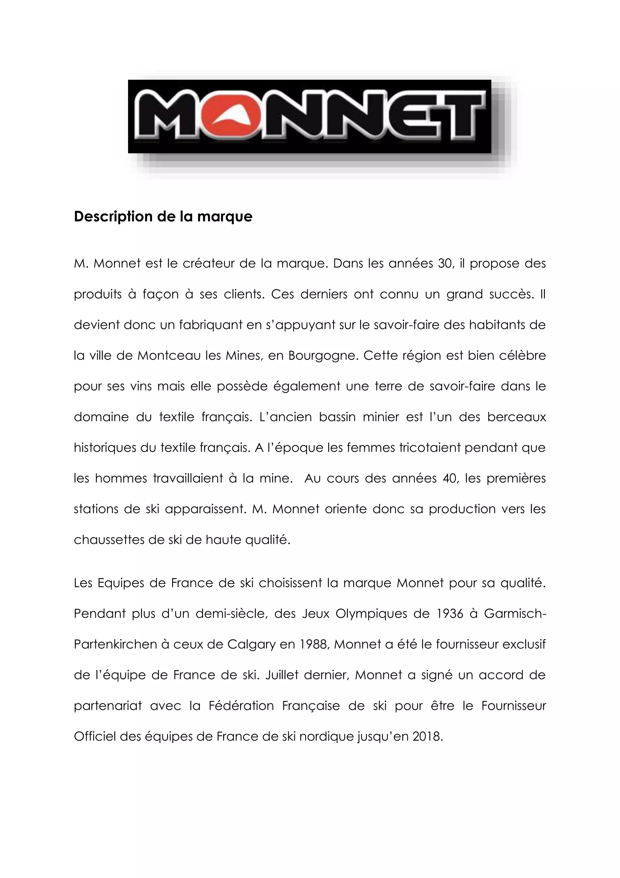 La marque M. Monnet, fondée dans les années 30, est réputée pour ses chaussettes de ski de haute qualité, devenant fournisseur exclusif de l'équipe de France de ski pendant plus de 50 ans. Elle allie savoir-faire local en textile et technologies avancées pour créer des produits adaptés aux sportifs de haut niveau, tout en maintenant une production 100% française. Avec des modèles mythiques et une approche centrée sur le confort et la technique, la marque continue d'innover et de satisfaire les besoins des athlètes et amateurs de plein air.