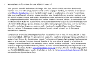 Les écouteurs Monster Beats by Dre se distinguent par leur qualité sonore et leur capacité à réduire le bruit de fond de plus de 70%. Ils sont conçus pour offrir une excellente expérience d'écoute, que ce soit pour regarder des films ou écouter de la musique, même dans des environnements bruyants. De plus, ces écouteurs incluent des accessoires utiles tels qu'un étui de transport et un adaptateur pour avion.