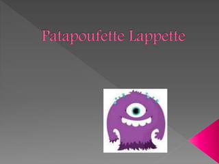 Patapoufette est un monstre coloré avec une personnalité excentrique et avide de surprises. Elle adore les activités créatives, mais son comportement peut parfois être tumultueux, allant de son côté bavard à ses crises de colère. Sa famille comprend son frère Patapouf, sa maman Mamouf, son papa Papouf et son meilleur ami Zipo.