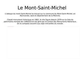 L'abbaye du Mont-Saint-Michel, classée monument historique et patrimoine mondial de l'UNESCO, est un site religieux majeur en Normandie, avec des origines remontant au 4ème siècle et à la fondation d'un oratoire en l'honneur de l'archange Saint Michel au 8ème siècle. Au cours des siècles, le site a été agrandi et restauré, notamment par Viollet-le-Duc au 19ème siècle, et a connu une renaissance religieuse avec l'arrivée de moines en 1966. Aujourd'hui, une communauté monastique assure une présence religieuse, perpétuant la dimension spirituelle du Mont.