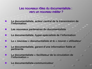 Le document traite des nouveaux rôles du documentaliste dans un environnement en évolution, mettant l'accent sur son rôle central dans la transmission de l'information et sa collaboration avec divers partenaires. Il explore également les compétences requises pour le documentaliste moderne, telles que la vérification de l'information et l'adaptation aux nouvelles technologies. Enfin, il souligne l'importance de la communication et du partenariat avec les utilisateurs pour assurer une information fiable et pertinente.