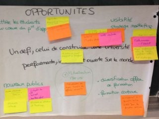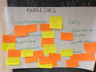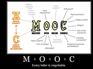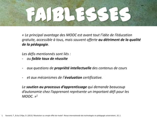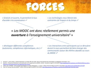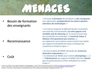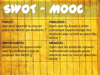 Le document aborde la place des MOOC dans l'éducation, soulignant leurs forces telles que l'accessibilité et la liberté d'apprentissage, ainsi que leurs faiblesses, comme le faible taux de réussite et les défis de la qualité pédagogique. Il discute également des opportunités qu'ils offrent aux institutions, comme l'augmentation de la visibilité et l'adaptation de l'offre de formation, tout en mettant en avant les menaces liées à la reconnaissance et aux coûts d'implémentation. Enfin, il évoque la nécessité de former les enseignants et d'améliorer l'infrastructure pour réussir la mise en place des MOOC.