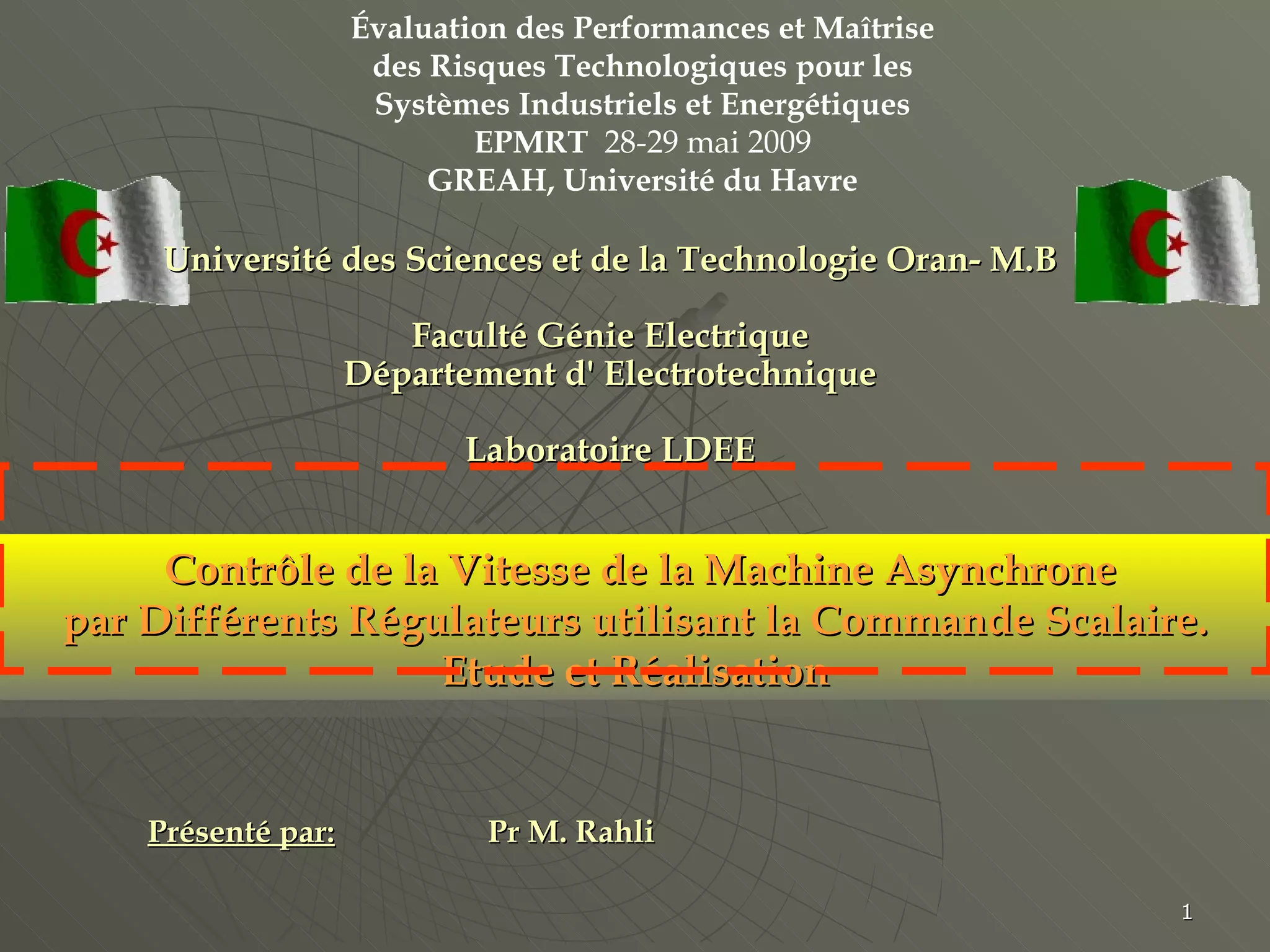 Ce document présente une étude sur la commande scalaire des machines asynchrones, mettant l'accent sur l'évaluation des performances et la maîtrise des risques technologiques. Il se concentre sur la modélisation des systèmes et les différents régulateurs utilisés pour contrôler la vitesse de la machine. Les résultats expérimentaux et de simulation sont comparés pour identifier les meilleures performances en termes de temps de réponse et rejet de perturbations.