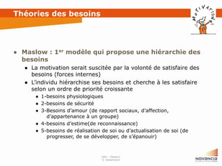 Le document présente plusieurs théories des besoins relatives à la motivation, notamment celles de Maslow, Alderfer, Herzberg, Atkinson et McClelland. Chacune de ces théories propose une approche différente pour comprendre comment la satisfaction des besoins peut influencer la motivation des individus au travail. Parmi les concepts clés, on trouve la hiérarchie des besoins de Maslow, les facteurs de motivation et d'hygiène de Herzberg, ainsi que la théorie de l'équité d'Adams.