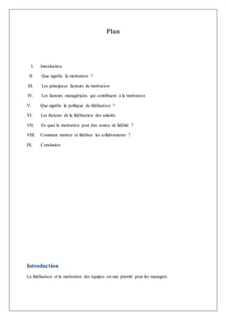 Le document traite de la motivation et de la fidélisation des salariés, soulignant leur importance pour les managers afin d'attirer et de retenir les talents dans un environnement de travail positif. Les principaux facteurs de motivation incluent le respect, l'écoute, et des entretiens réguliers, tandis que la fidélisation est liée à la satisfaction et à l'implication des employés envers l'entreprise. Des stratégies telles que l'amélioration des conditions de travail, l'organisation d'événements et l'offre d'avantages sociaux sont essentielles pour maintenir un personnel motivé et engagé.