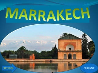 Marrakech, surnommée la perle du sud, est une ville marocaine fondée en 1062 et située au pied des montagnes de l'Atlas. Avec une population d'environ 909 000 habitants, elle est la quatrième plus grande ville du Maroc, divisée entre la médina historique et la ville nouvelle, Guéliz. La ville continue de s'agrandir vers la périphérie avec de nouveaux quartiers résidentiels.