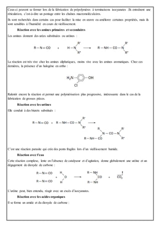 Le document traite des différentes classes de polyuréthannes, notamment les mousses expansées et compactes, ainsi que leurs applications. Il aborde également les réactions chimiques impliquées lors de la fabrication, incluant l'interaction des isocyanates avec divers composés et la formation de macromolécules. Enfin, il décrit les matières premières utilisées, en mettant l'accent sur les polyols et les isocyanates, ainsi que sur les agents d'expansion et les catalyseurs nécessaires à la production de polyuréthannes.