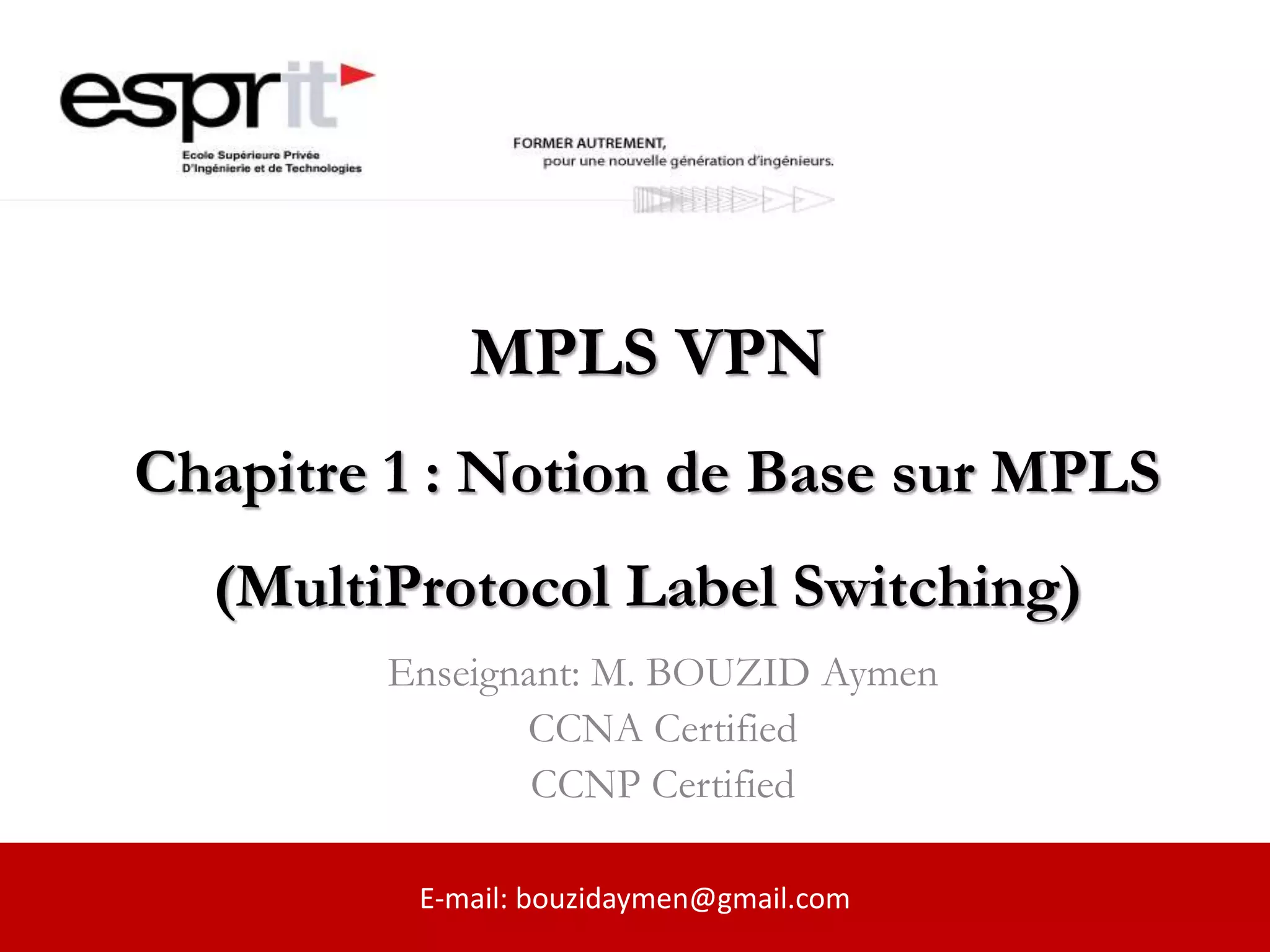 Ce document traite des principes fondamentaux de MPLS (Multiprotocol Label Switching), y compris la commutation par label, la distribution et la gestion des labels dans le routage des paquets. Il met en évidence l'importance de MPLS pour améliorer la vitesse de transfert et offrir des services comme les réseaux privés virtuels et le traffic engineering. Le fonctionnement des protocoles tels que TDP, LDP et RSVP, ainsi que les tables MPLS (LIB, LFIB, FIB), est également expliqué.
