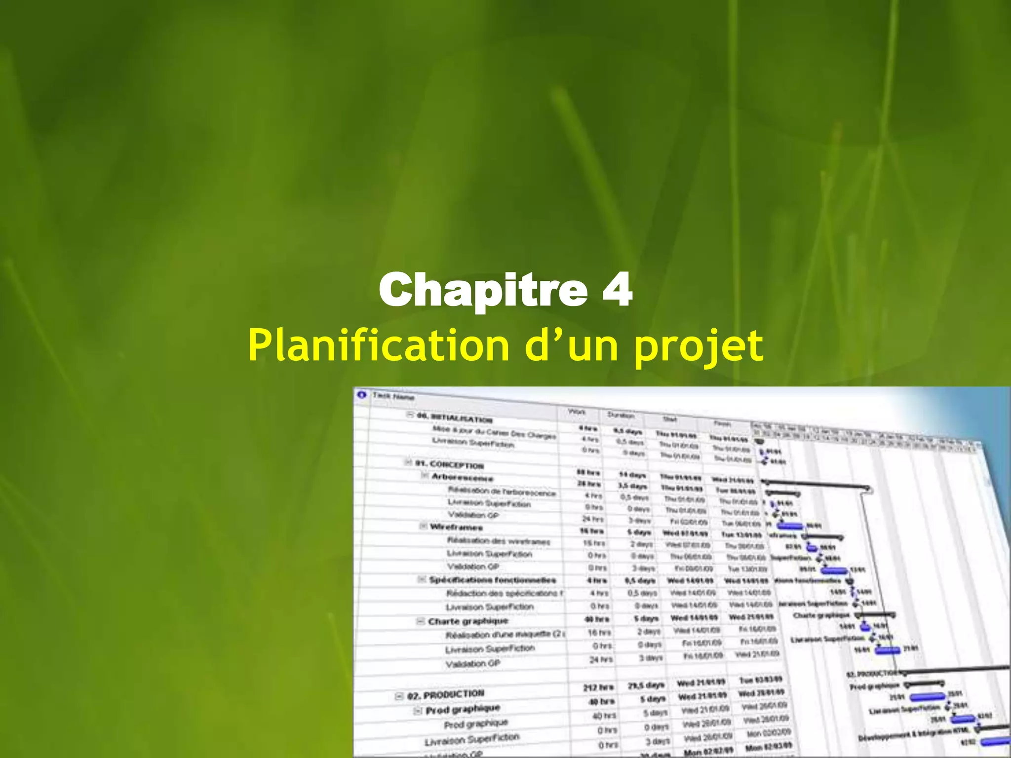 Ce document décrit la planification d'un projet à l'aide d'outils tels que MS Project, en abordant la création de tâches, dépendances et jalons, ainsi que la gestion de tâches périodiques et récapitulatives. Il explique les concepts de liaison entre les tâches, notamment les dépendances de type fin-début, fin-fin, début-début et début-fin, ainsi que la gestion des contraintes. Enfin, il souligne l'importance du chemin critique pour déterminer la durée totale du projet.