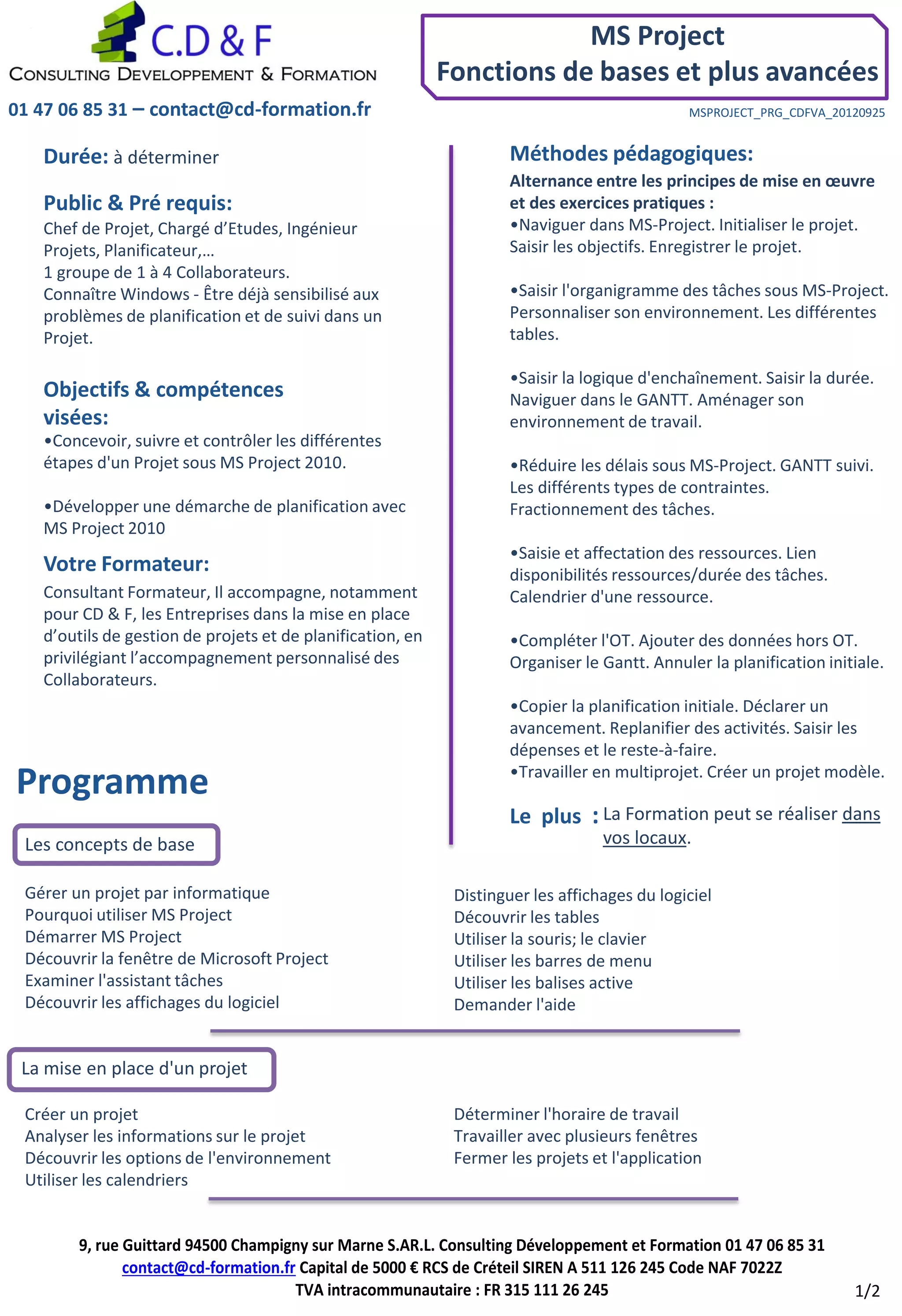 Ce document présente une formation sur l'utilisation de MS Project, axée sur des compétences de base et avancées pour la gestion de projets. Les participants apprendront à naviguer dans le logiciel, à saisir des tâches, à gérer des ressources et à suivre l'avancement d'un projet. La formation est destinée à des chefs de projet et autres professionnels de la planification, avec une approche pratique et personnalisée.