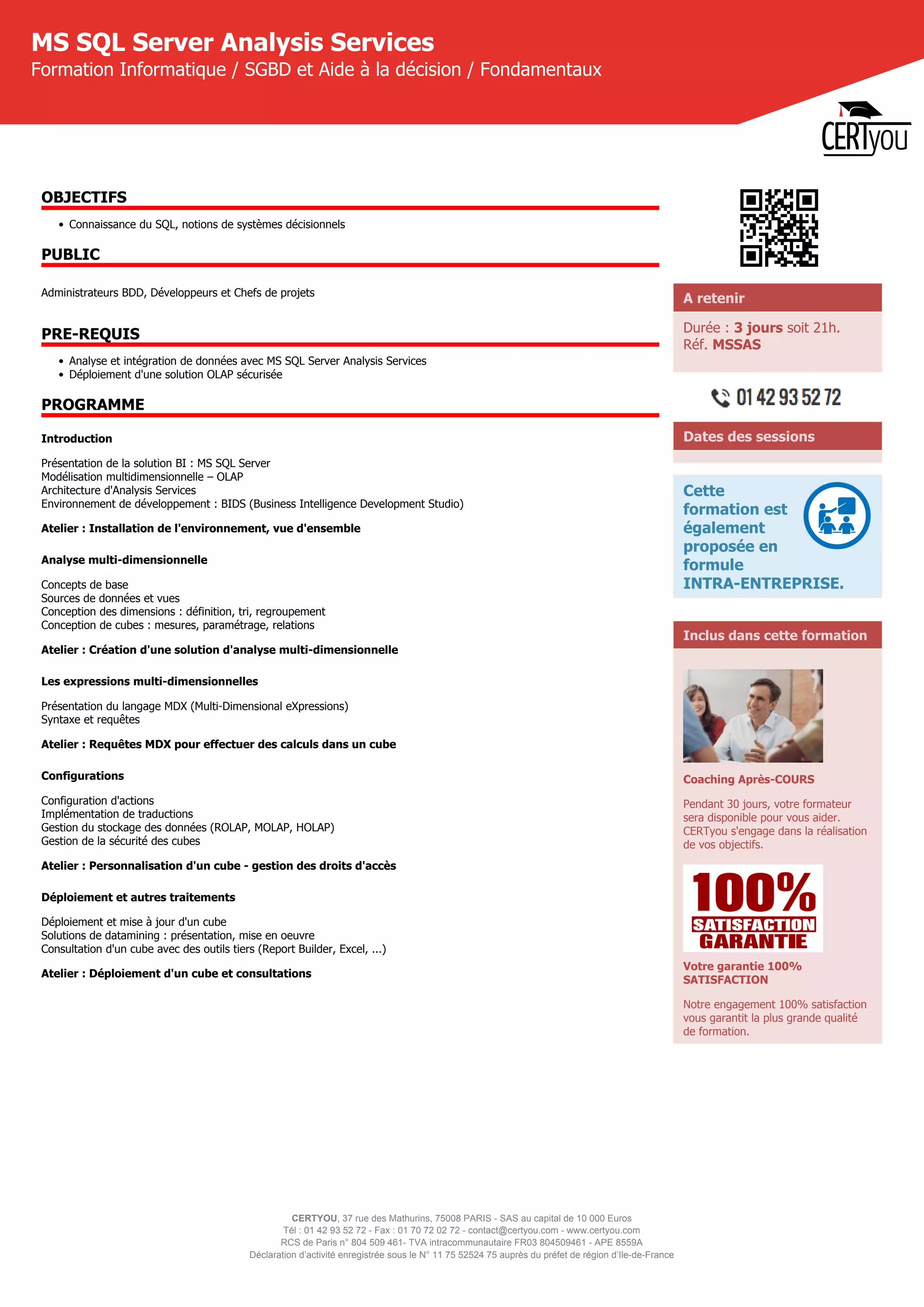 Certyou propose une formation de 3 jours sur MS SQL Server Analysis Services, visant à fournir des connaissances sur la modélisation multidimensionnelle et l'analyse OLAP. Le programme inclut des ateliers pratiques sur la création de cubes, le langage MDX, et la gestion de la sécurité des données. Un coaching post-formation est inclus pour assurer la satisfaction des participants.