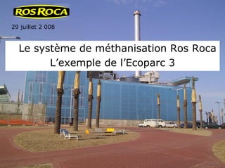 Le document présente la technologie de bio-méthanisation du groupe Ros Roca, utilisée dans des installations de gestion des déchets organiques, notamment l'Ecoparc 3 à Sant Adrià, près de Barcelone. Cette technologie se caractérise par un processus de pré-traitement efficace et un digesteur spécifique permettant de produire du bio-gaz, de l'énergie électrique et du compost à partir des déchets. Les installations sont équipées de nombreux systèmes pour garantir l'efficacité du traitement et minimiser l'impact environnemental.