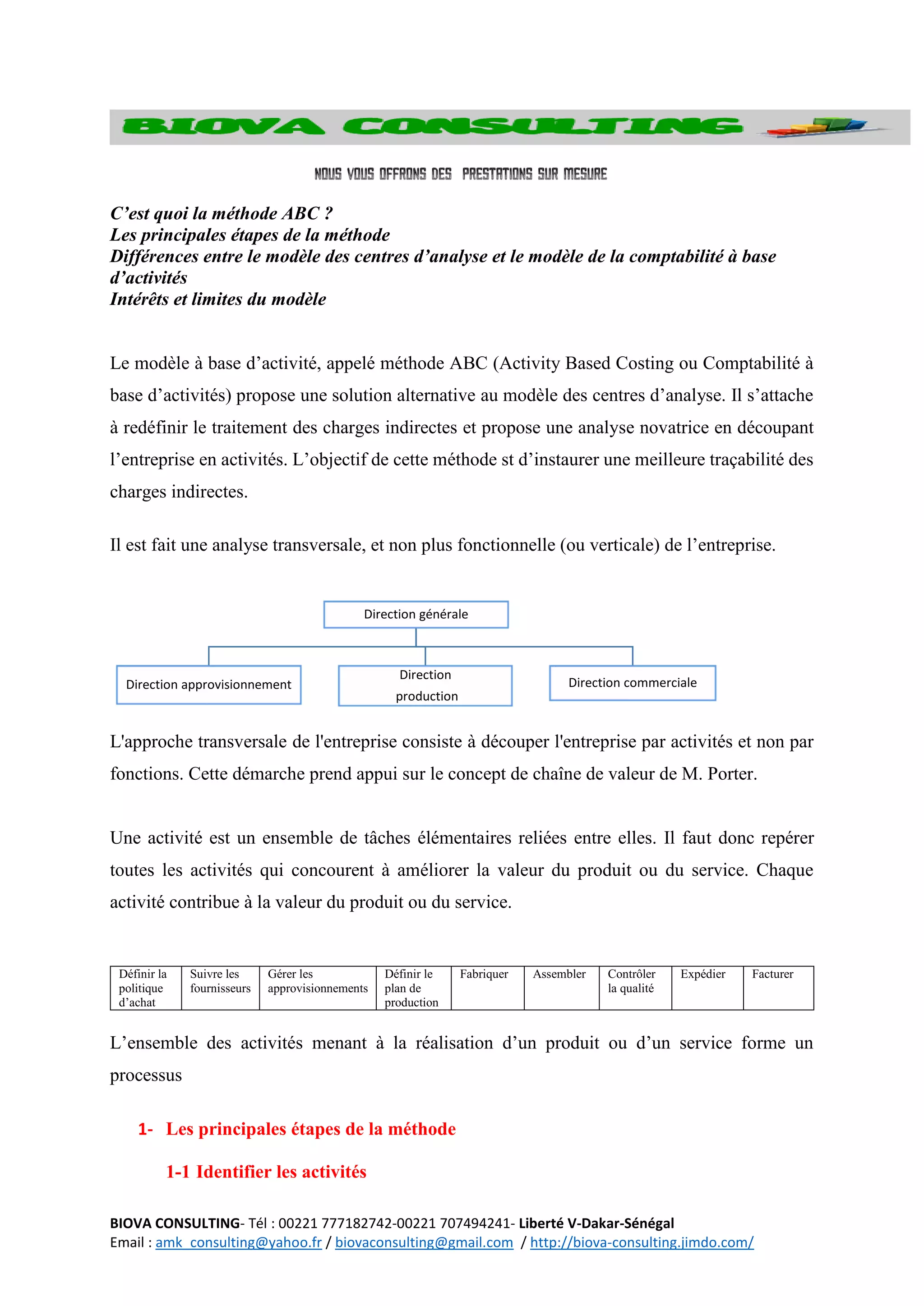 La méthode ABC (Activity Based Costing) redéfinit le traitement des charges indirectes en analysant l'entreprise par activités, offrant ainsi une meilleure traçabilité des coûts. Les principales étapes incluent l'identification des activités, l'affectation des ressources, et la détermination des inducteurs d'activité. Bien qu'elle améliore la répartition des charges et la prise de décision, la complexité de sa mise en œuvre peut être une limitation.