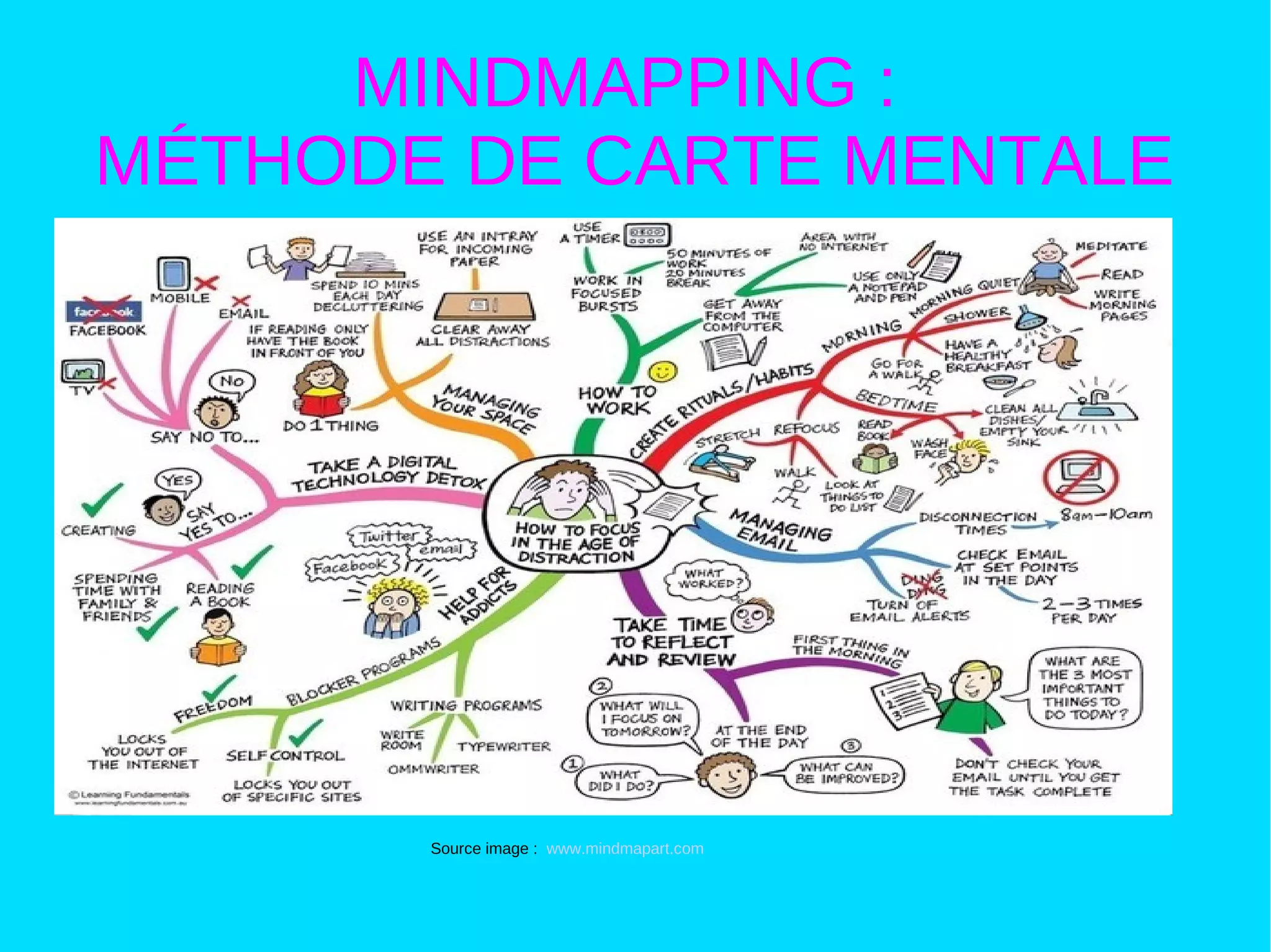 La carte mentale, ou heuristique, est une méthode pour organiser visuellement l'information autour d'une idée principale, facilitant ainsi la compréhension et la mémorisation. Elle nécessite une structuration claire des idées et l'utilisation d'éléments graphiques comme des couleurs et des formes pour relier les concepts. Ce document propose des conseils pratiques et des exemples de création de cartes mentales.