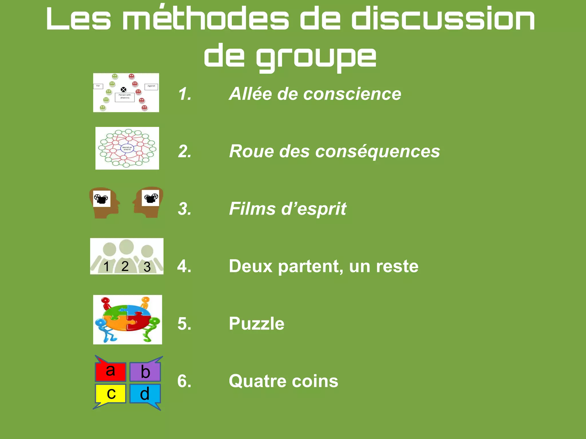 Le document présente plusieurs méthodes de discussion en groupe, telles que la 'allée de conscience', la 'roue des conséquences', et d'autres activités qui favorisent la réflexion critique et l'engagement des élèves. Ces techniques encouragent les apprenants à explorer divers sujets, à discuter leurs opinions et à développer une compréhension plus approfondie des thèmes abordés. Chaque méthode inclut des instructions sur son utilisation et les moments où elles sont le plus pertinentes dans un contexte éducatif.
