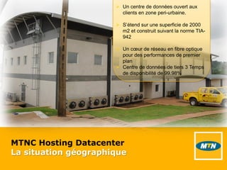 Le centre de données MTNC Hosting, situé en zone péri-urbaine sur 2000 m2, est conçu selon la norme TIA-942, offrant une disponibilité de 99,98%. Il dispose d'un système d'alimentation électrique redondant, de groupes électrogènes, et d'un système de gestion de bâtiment avec sécurité incendie et contrôle d'accès. Écologique, le centre utilise un refroidissement à eau optimisé et propose 140 baies informatiques modulaires.